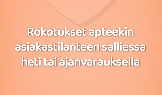 Apteekkimme rokotepisteellä voit ottaa tarvitsemasi rokotteet apteekkikäyntisi yhteydessä helposti ja turvallisesti. Voit varata ajan rokotukseen kätevästi netissä osoitteesta: www.rokotepiste.fi tai apteekista paikan päältä. Mikäli meillä on vapaa rokotusaika, pääset halutessasi heti rokotettavaksi.